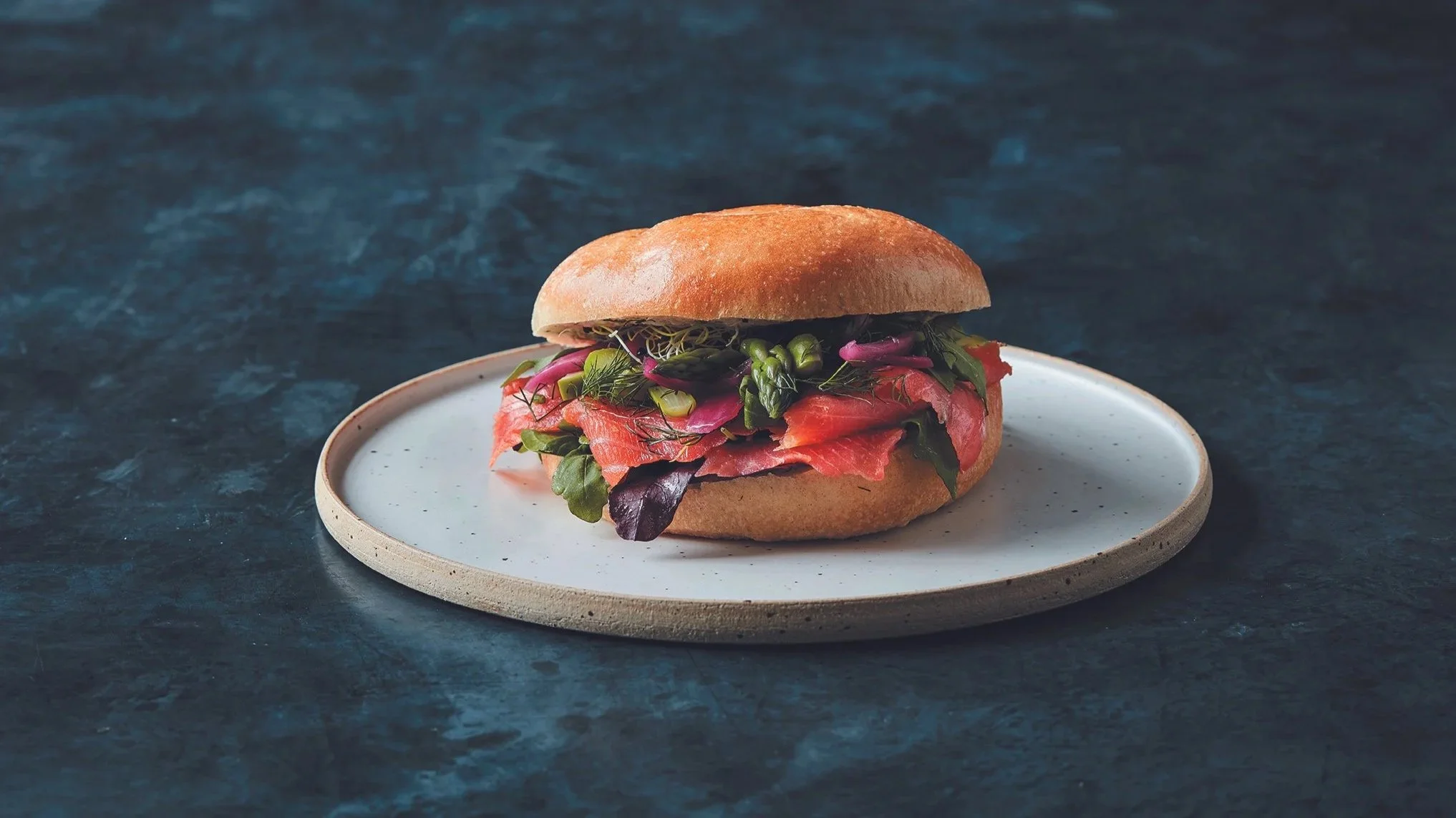 Hjemmelavet og friskbagt sandwichbolle (lys, grov eller rugbrød) med fyld af laks, kylling, roastbeef, vegetar, m.v.